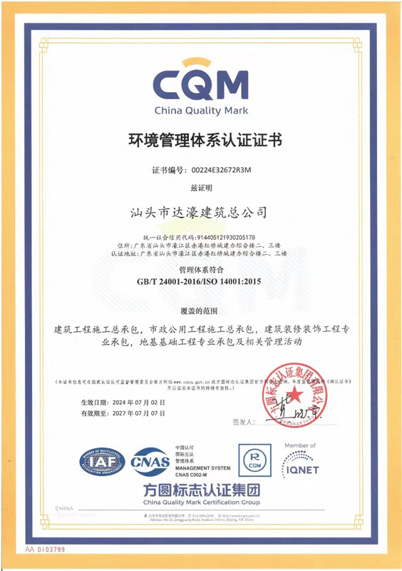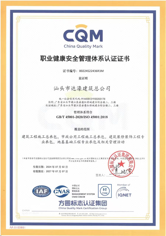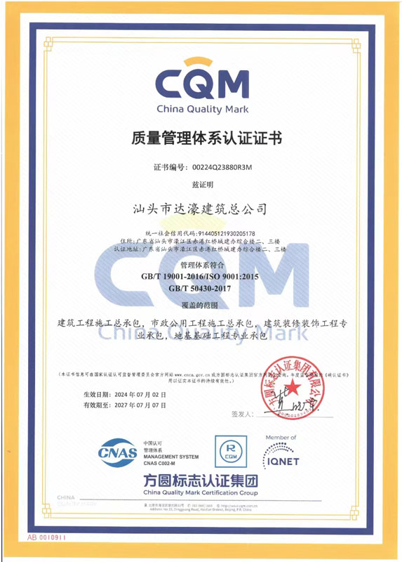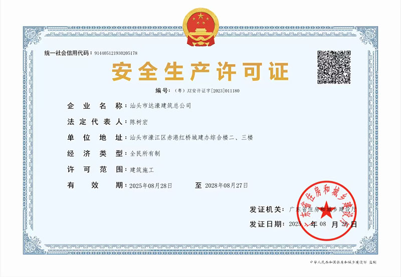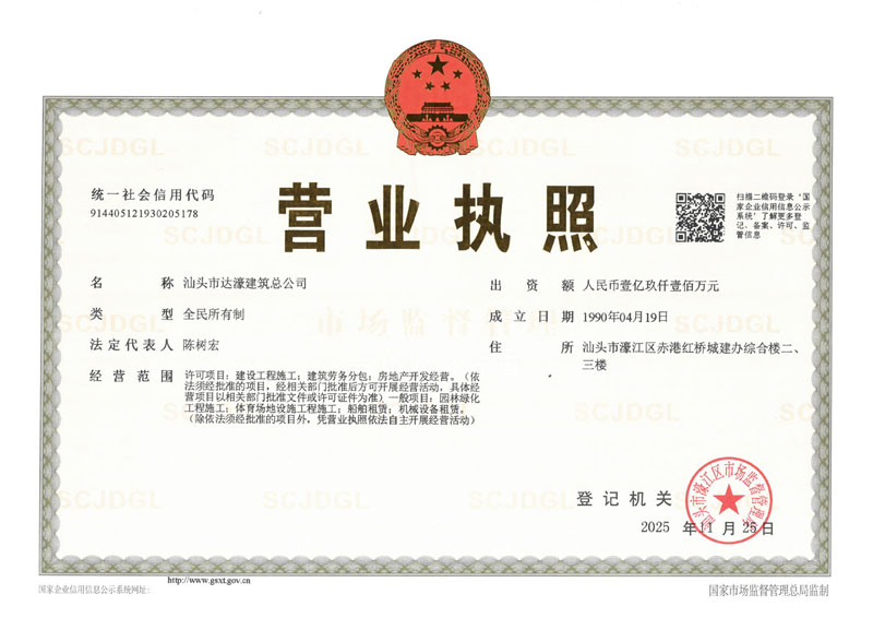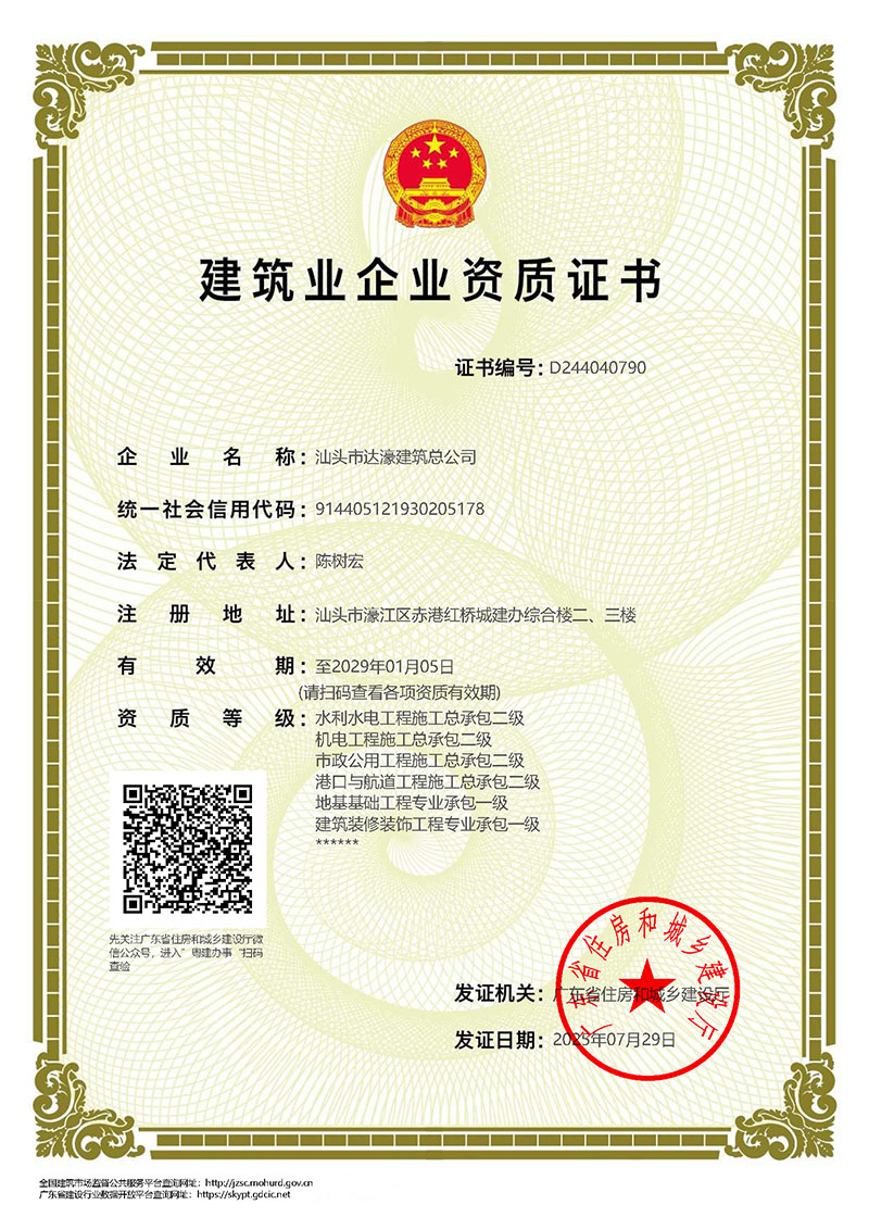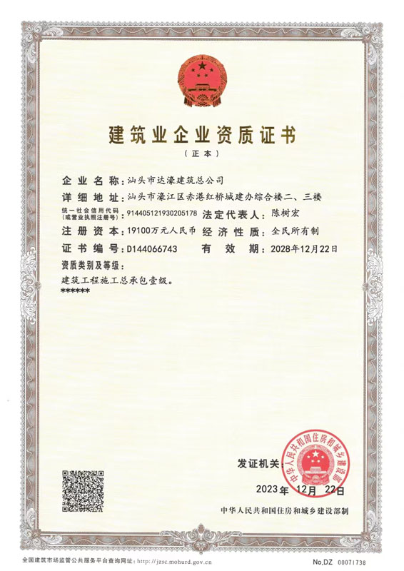 汕頭市達濠建筑總公司成立于1975年?,F企業(yè)注冊資金壹億玖仟壹佰萬元,是具有建筑工程施工總承包壹級、建筑裝修裝飾工程專業(yè)承包壹級、地基基礎工程專業(yè)承包壹級、市政公用工程施工總承包貳級、港口與航道工程施工總承包貳級、機電工程施工總承包貳級、水利水電工程施工總承包叁級、鋼結構工程專業(yè)承包叁級、建筑裝飾工程設計專項乙級資質的全民所有制企業(yè)。2005年12月經商務部批準獲得承包境外房屋建筑、建筑裝修裝飾及地基與基礎工程和境內國際招標工程資格。