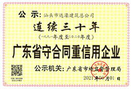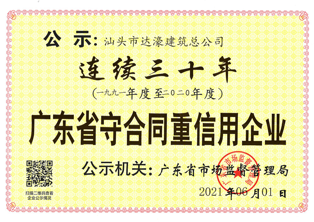 公司的經營方針是:科學管理、質量第一、信守合同、優(yōu)質服務。近年來,公司出色地完成了多項施工難度大、技術要求高、施工工藝先進的大型工程,參建的"深圳卓越皇崗世紀中心項目2號樓及裙樓配套工程"等3個項目獲得建設部"中國建筑工程魯班獎";承建的"中信井岡山國際會議中心國賓樓酒店工程"獲得全國建筑工程裝飾獎,多個工程項目被評為省、市優(yōu)質工程和雙優(yōu)工地。"清水混凝土施工工法"等三個施工工法被廣東省住建廳批準為省級工法。公司連續(xù)二十九年被廣東工商行政管理局授予"守合同重信用"企業(yè)稱號。連年來,企業(yè)被汕頭市人民政府、市住建局、市地稅局授予"先進施工企業(yè)"、"納稅大戶"、"A級納稅人"等榮譽稱號。
